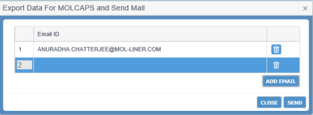 Button to export Booking information for space utilization checking. Voyage Controller can send the exported Booking data to MOLCAPS. Clicking the button opens the Export Data for MOLCAPS and Send MailExport Data for MOLCAPS and Send Mail dialog box. By default, the logged-on user's e-mail ID is populated in it. You can edit/delete it or add other e-mail addresses and send the e-mail.