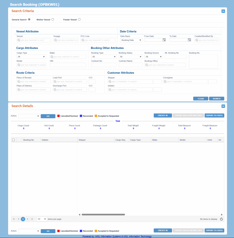 Search Criteria panel: You can search by Vessel attributes, Booking Date criteria, Booking user who created/last updated Booking, Cargo attributes, Booking Type, Status, Booking number, Status, Maker, VIN, Booking office, Contract number/name, Booking Source, Alternate Booking No., Route and Customer etc. Based on the given criteria, the matching Bookings are retrieved in the Search Detail panel. You can perform search using three modes: General Search, Mother Vessel, and Feeder Vessel. Notes: