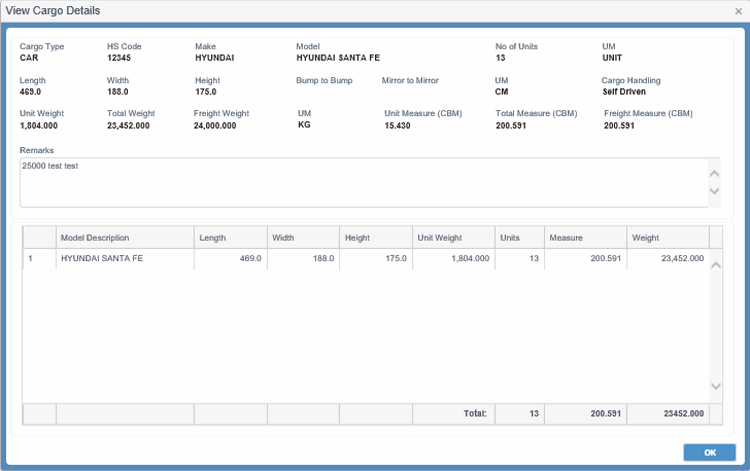 Name of the Cargo Model appears as a hyperlink. Clicking this link lets you view the corresponding Cargo attributes and its details in the View Cargo DetailsView Cargo Details pop-up. Moreover, when you hover the pointer over the Model Description field in this pop-up, the entire Cargo description appears as a tool tip.