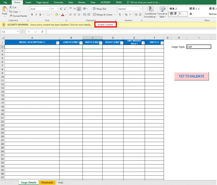 - Click YET TO VALIDATE to check Length, Weight, and Height values you have entered against the corresponding threshold values for the selected cargo type.
