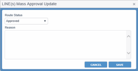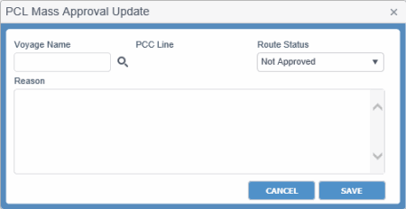 Button to approve the Line or PCL legs. On clicking this button, the Mass Approval Update dialog box appears. Display of this dialog box differs for the PCL (with Voyage) or LinePCL (with Voyage) or Line category and PCL (without Voyage)PCL (without Voyage) category.