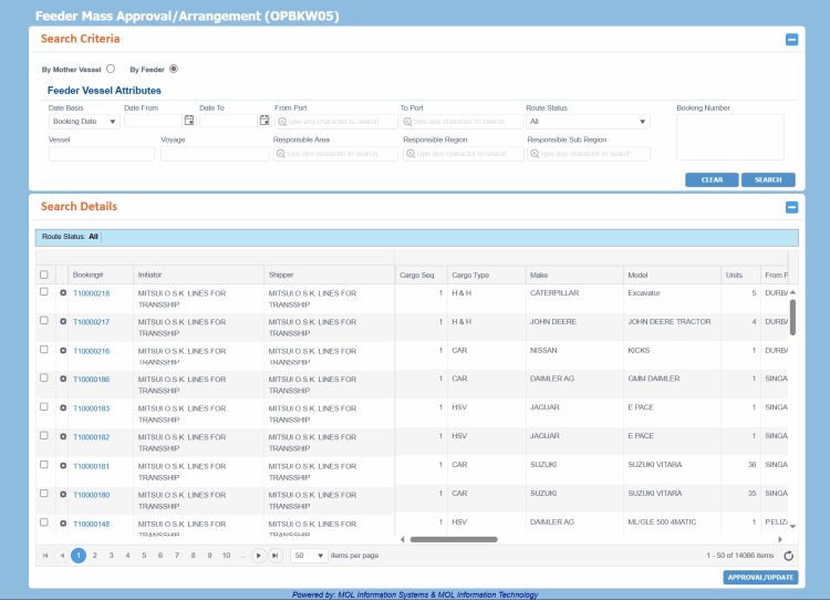 The Feeder Mass Approval/Arrangement screen lets you approve, arrange, or reject the Feeder legs of multiple Bookings at once. You can search for specific Feeder legs to approve/arrange using this screen.